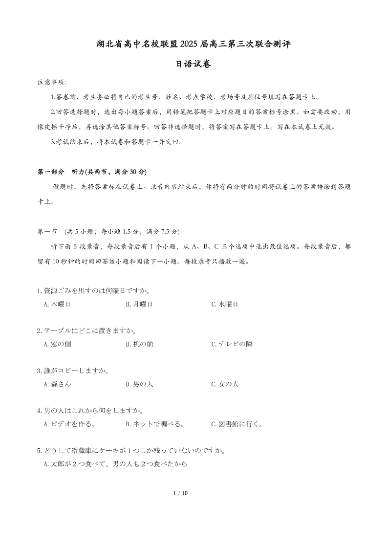 湖北省圆创高中名校联盟2025届高三第三次联合测评日语