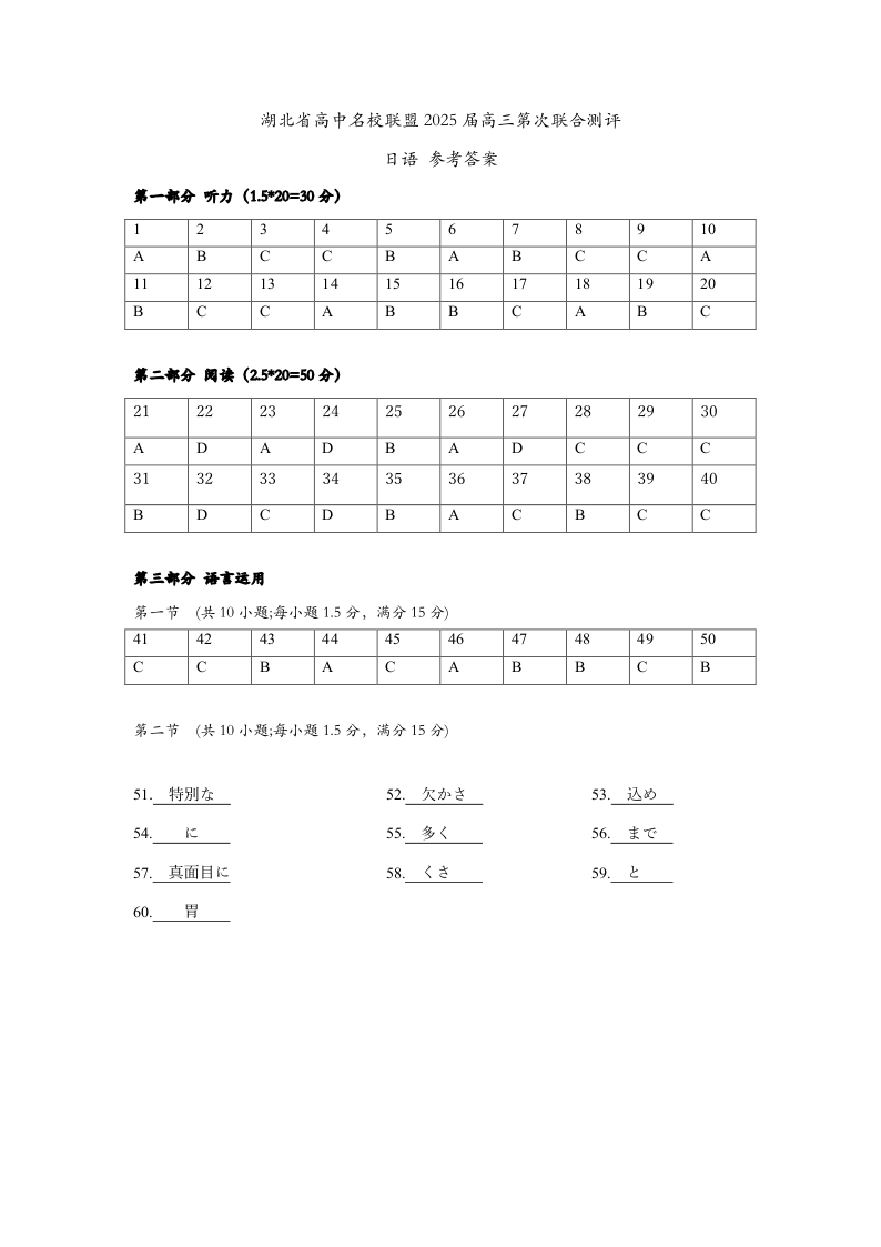 湖北省圆创高中名校联盟2025届高三第三次联合测评日语答案