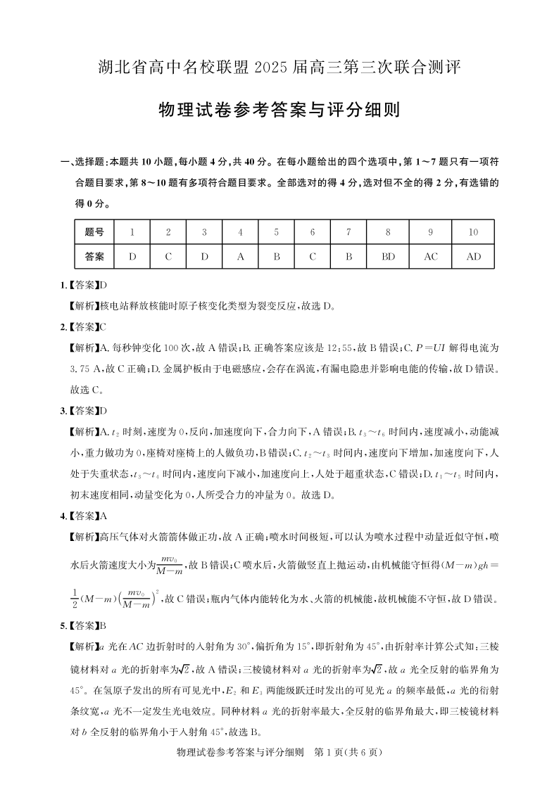 湖北省圆创高中名校联盟2025届高三第三次联合测评物理答案
