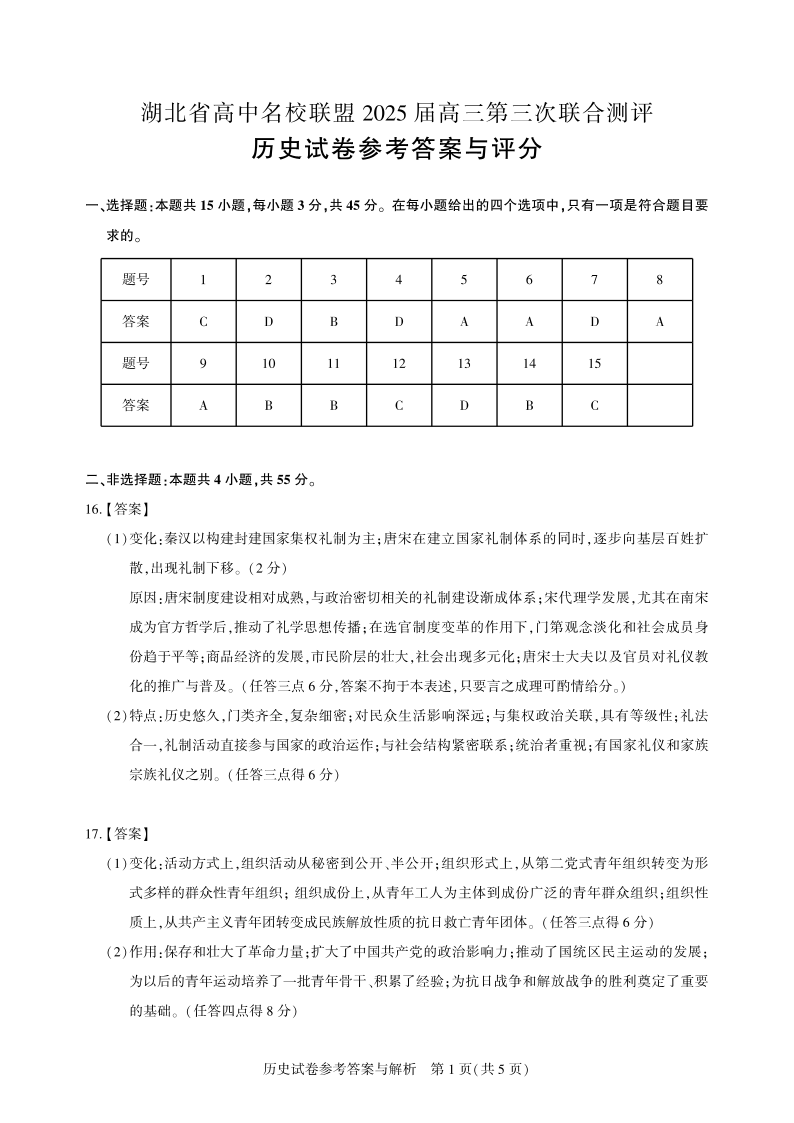 湖北省圆创高中名校联盟2025届高三第三次联合测评历史答案