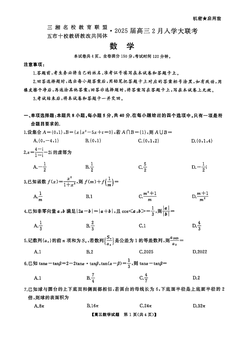 湖南省三湘名校教育联盟五市十校教研教改共同体高三下学期2月入学大联考数学