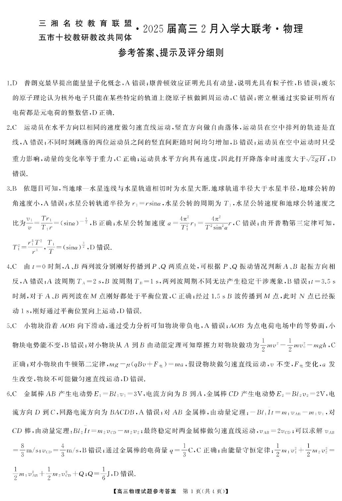 湖南省三湘名校教育联盟五市十校教研教改共同体高三下学期2月入学大联考物理答案