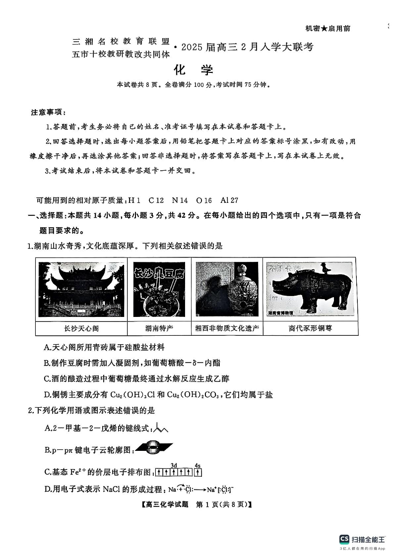 湖南省三湘名校教育联盟五市十校教研教改共同体高三下学期2月入学大联考化学