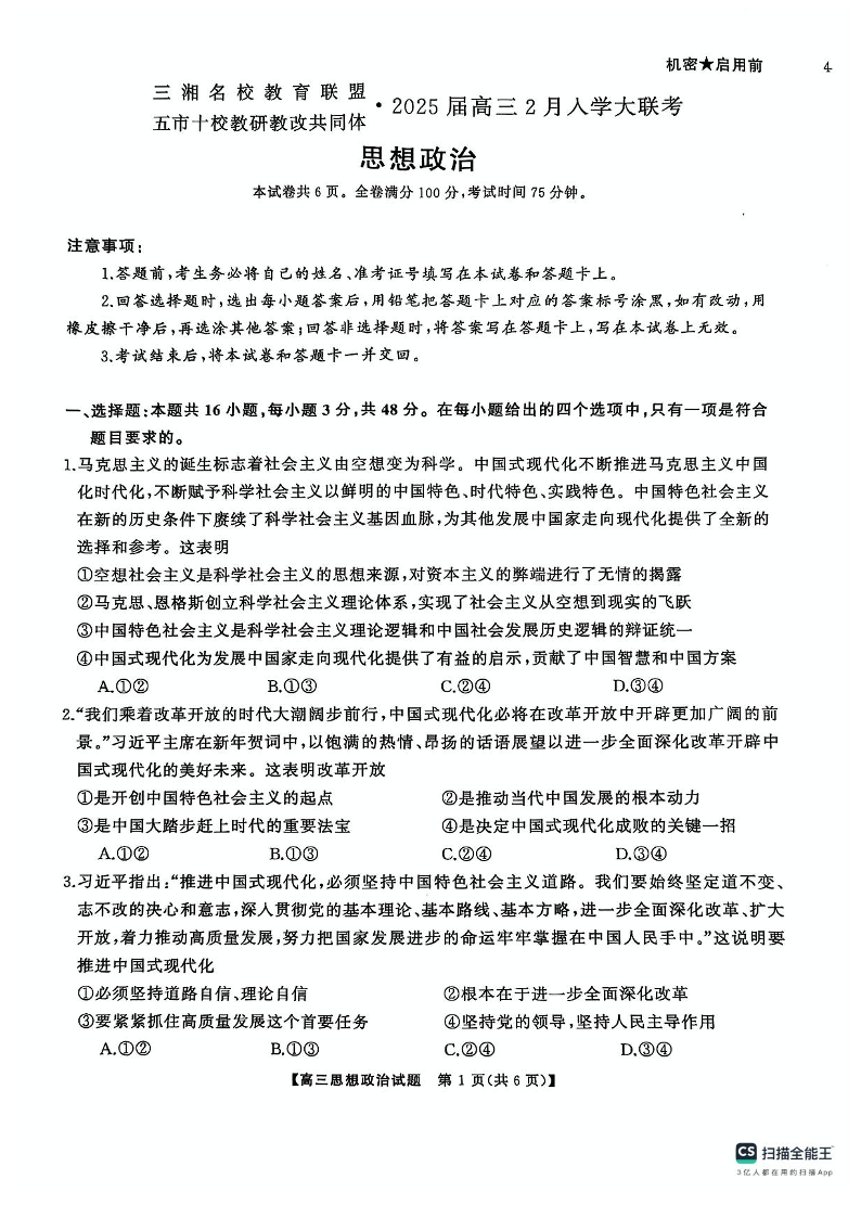 湖南省三湘名校教育联盟五市十校教研教改共同体高三下学期2月入学大联考政治+答案