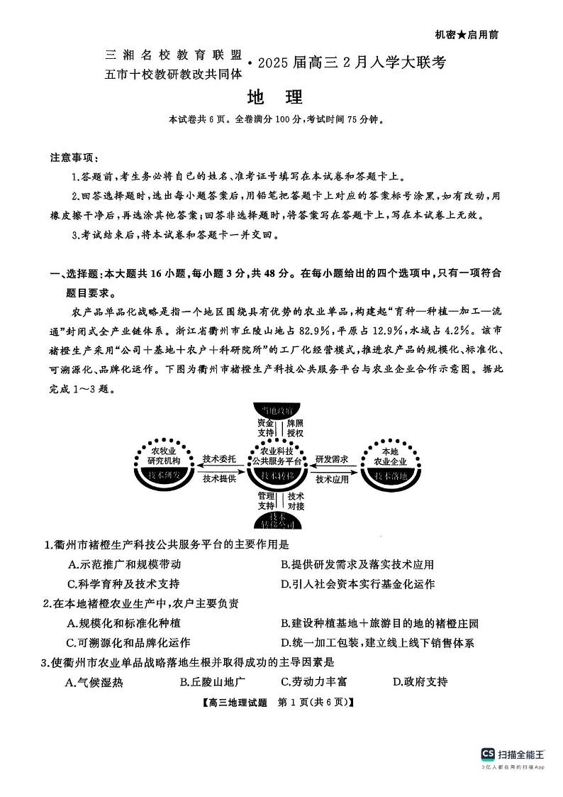 湖南省三湘名校教育联盟五市十校教研教改共同体高三下学期2月入学大联考地理+答案