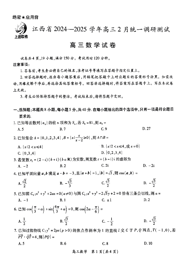 江西省上进联考2025届高三下学期2月统一调研测试数学