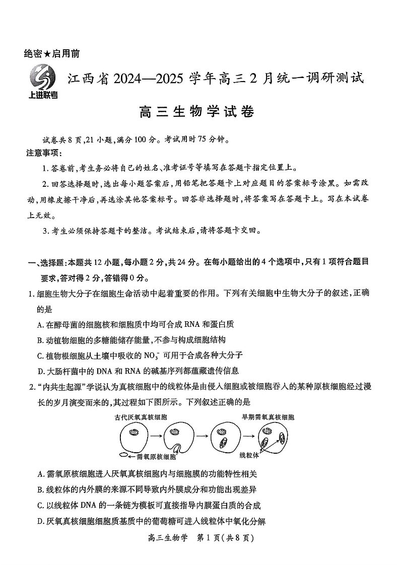 江西省上进联考2025届高三下学期2月统一调研测试生物+答案