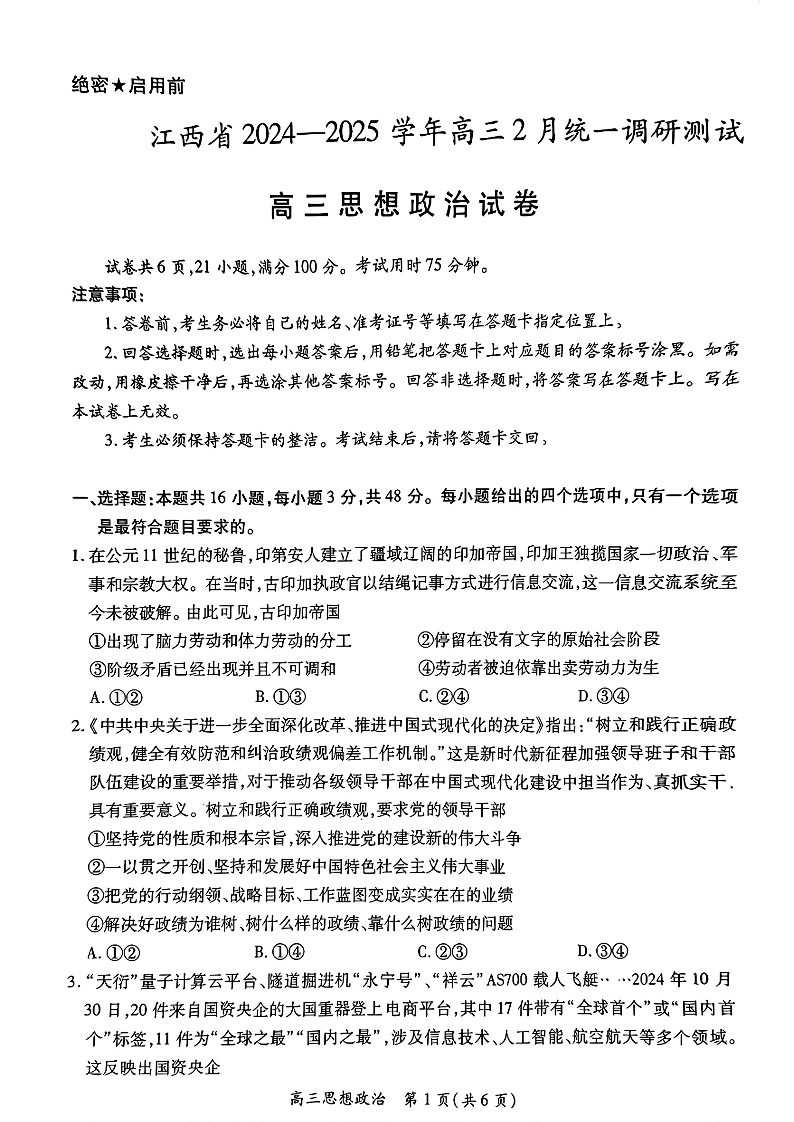 江西省上进联考2025届高三下学期2月统一调研测试政治+答案