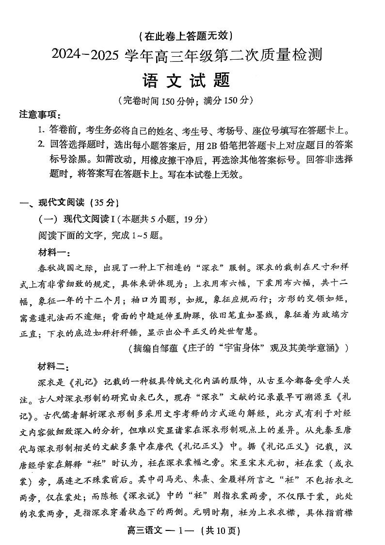 福建省福州市2024-2025学年下学期2月高三第二次质量检测语文