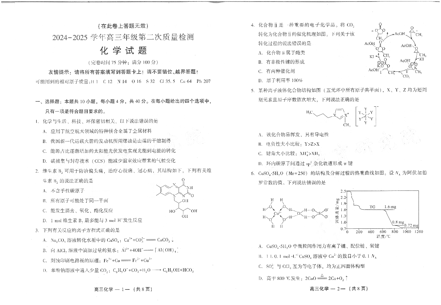 福建省福州市2024-2025学年下学期2月高三第二次质量检测化学