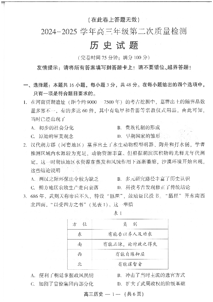 福建省福州市2024-2025学年下学期2月高三第二次质量检测历史