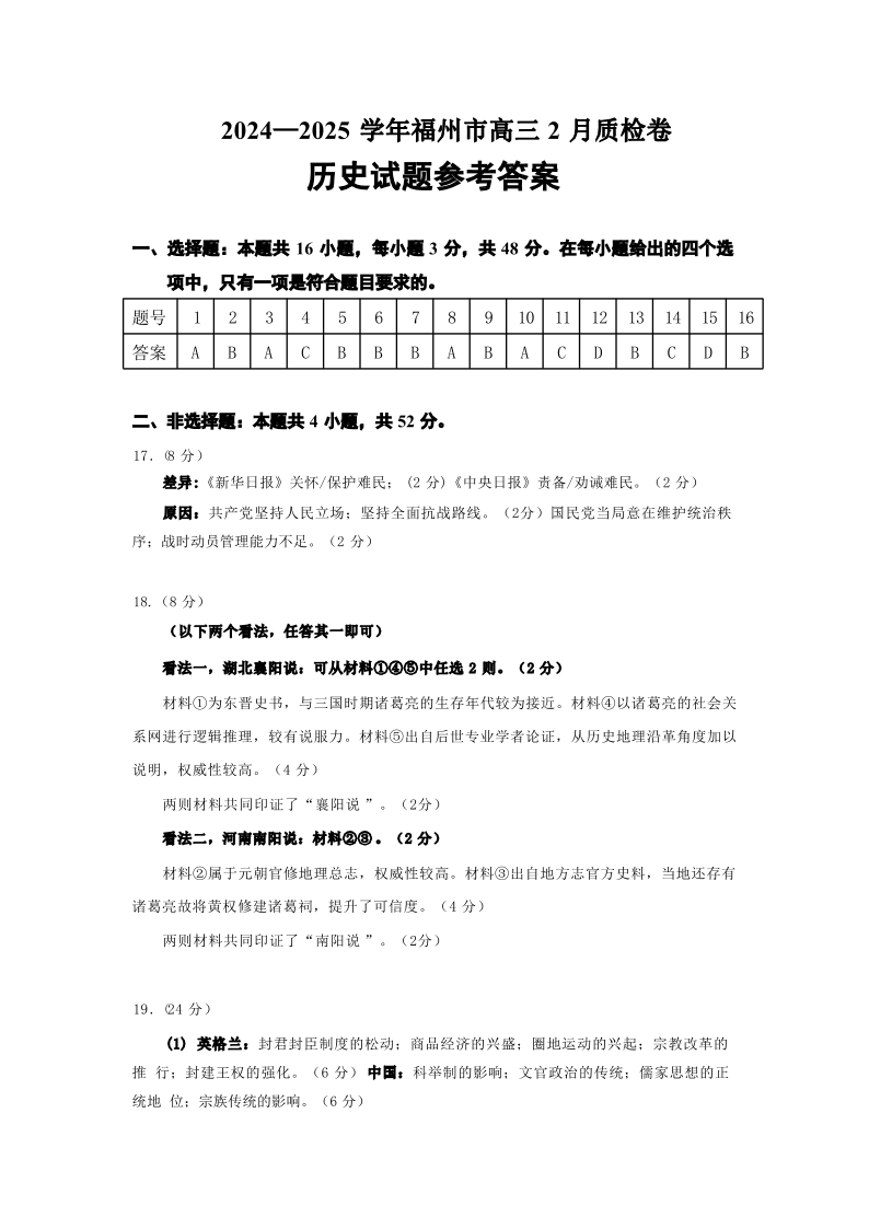 福建省福州市2024-2025学年下学期2月高三第二次质量检测历史答案