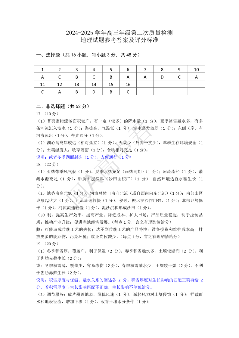 福建省福州市2024-2025学年下学期2月高三第二次质量检测地理答案