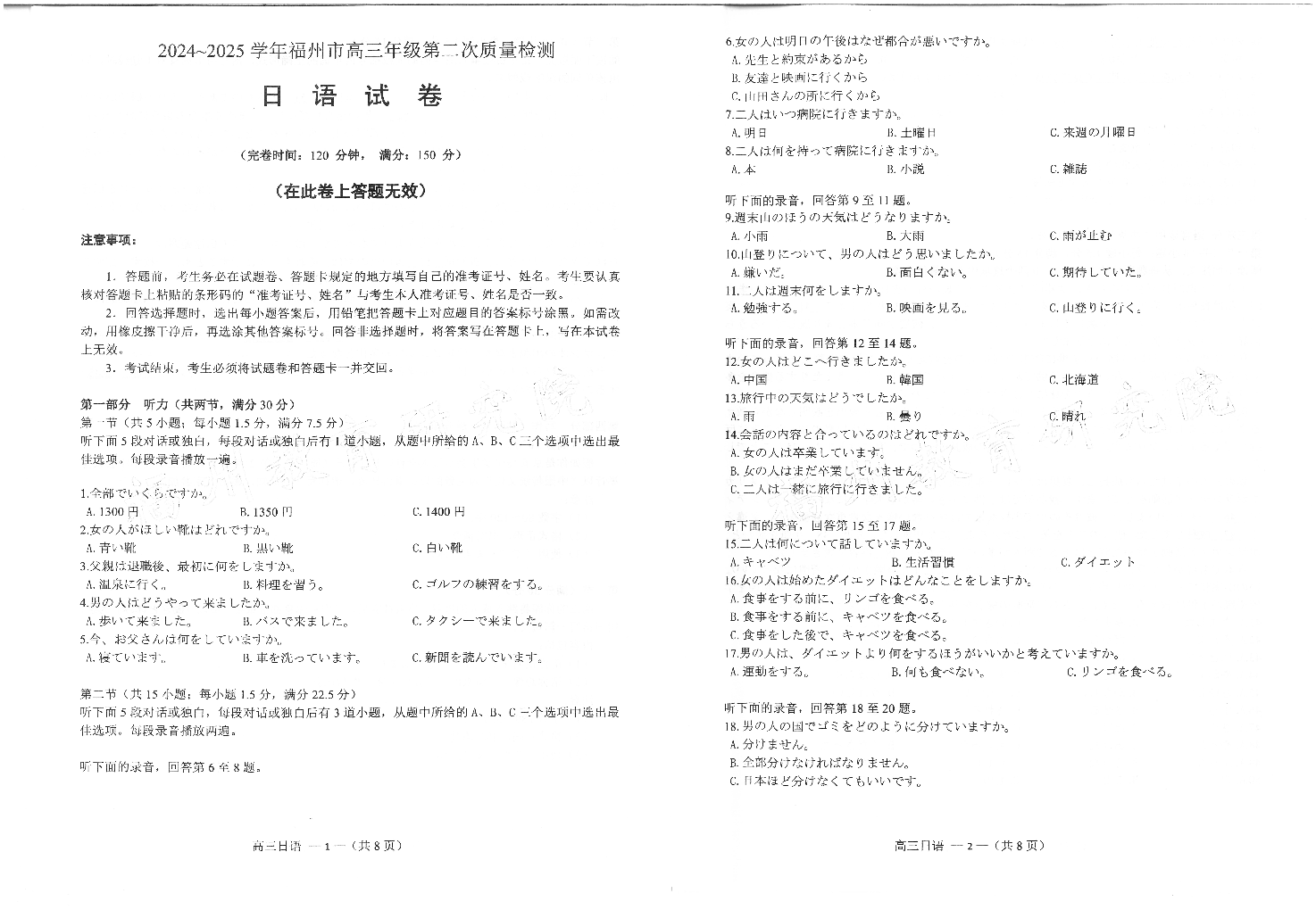 福建省福州市2024-2025学年下学期2月高三第二次质量检测日语