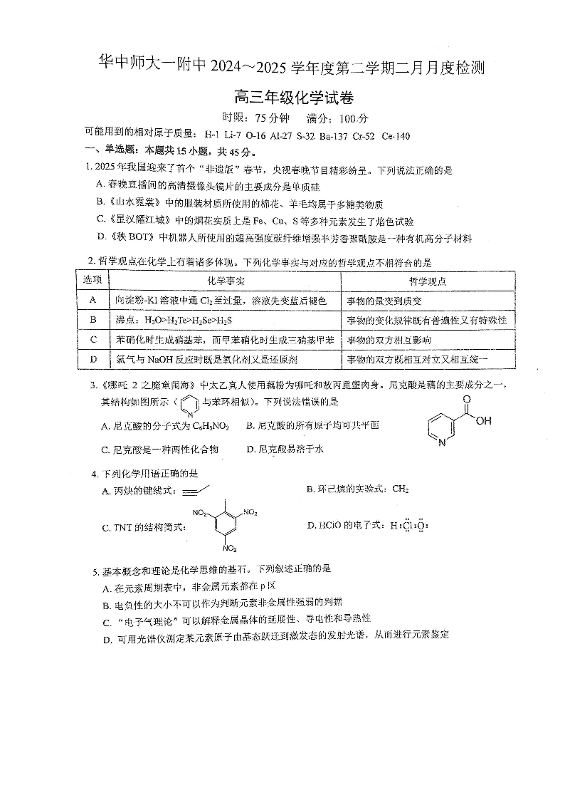 湖北省华中师大一附中2024-2025学年下学期2月高三开学考试化学