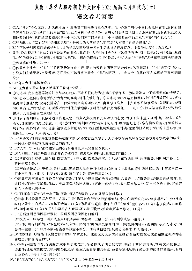 湖南省师大附中2024-2025 学年下学期2月高三月考试卷(六)语文答案