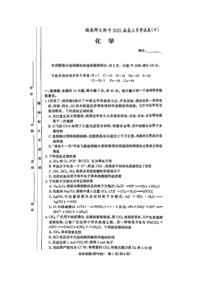 湖南省师大附中2024-2025 学年下学期2月高三月考试卷(六)化学+答案