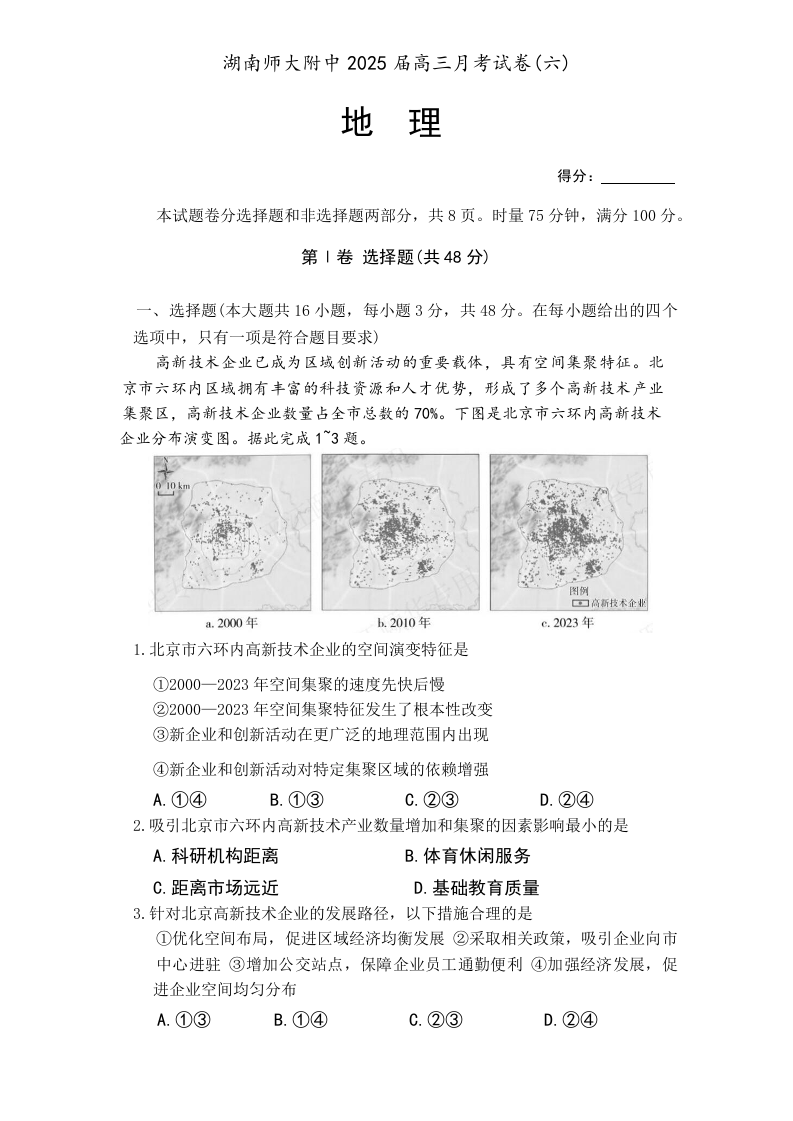 湖南省师大附中2024-2025 学年下学期2月高三月考试卷(六)地理