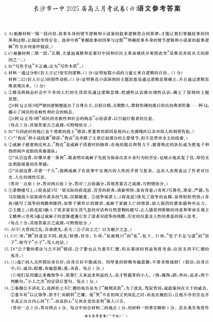 湖南省长沙市一中 2024-2025 学年下学期2月高三月考试卷(六)语文答案