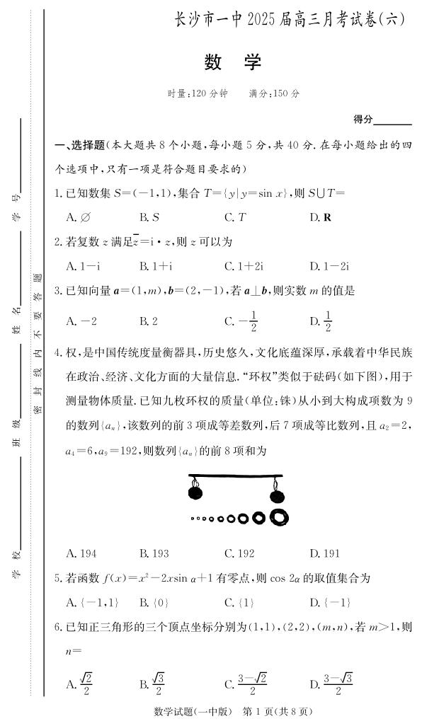 湖南省长沙市一中 2024-2025 学年下学期2月高三月考试卷(六)数学