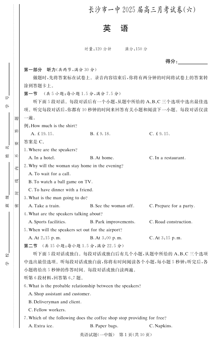 湖南省长沙市一中 2024-2025 学年下学期2月高三月考试卷(六)英语
