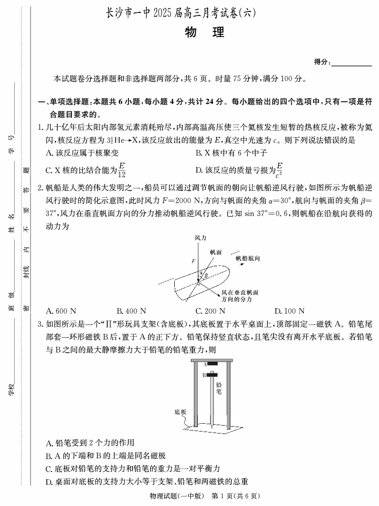 湖南省长沙市一中 2024-2025 学年下学期2月高三月考试卷(六)物理