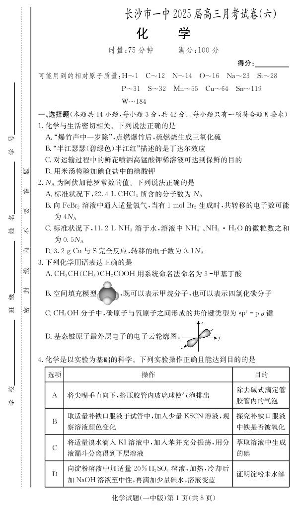 湖南省长沙市一中 2024-2025 学年下学期2月高三月考试卷(六)化学