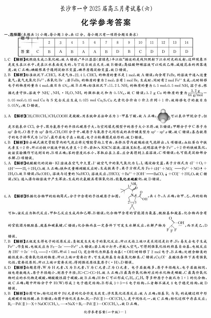 湖南省长沙市一中 2024-2025 学年下学期2月高三月考试卷(六)化学答案