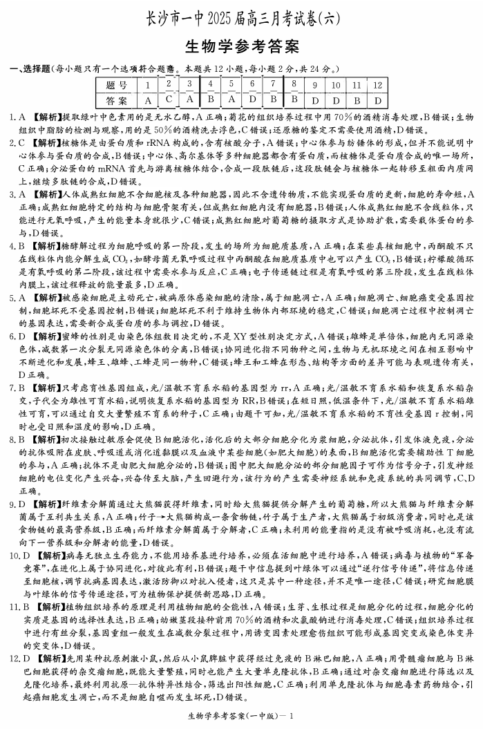 湖南省长沙市一中 2024-2025 学年下学期2月高三月考试卷(六)生物答案
