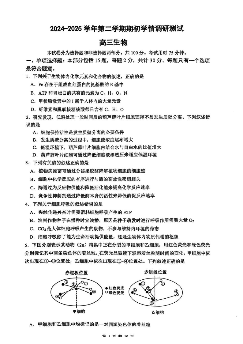 江苏省南京市六校联合体2024-2025学年下学期2月高三调研考试生物