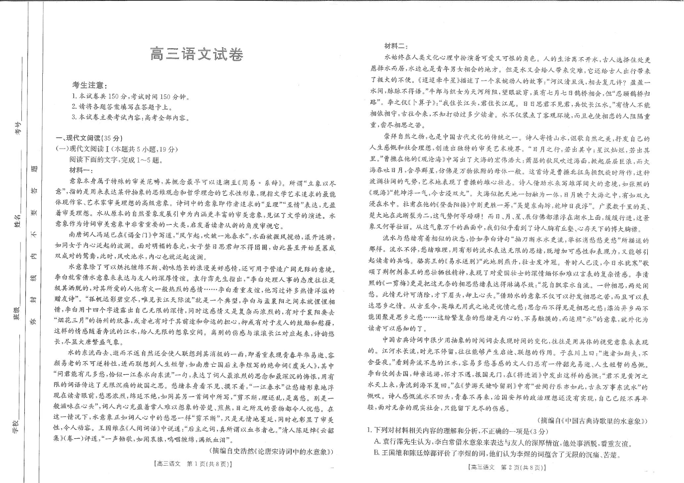 江西省区域高中2024-2025学年下学期2月高三联考语文
