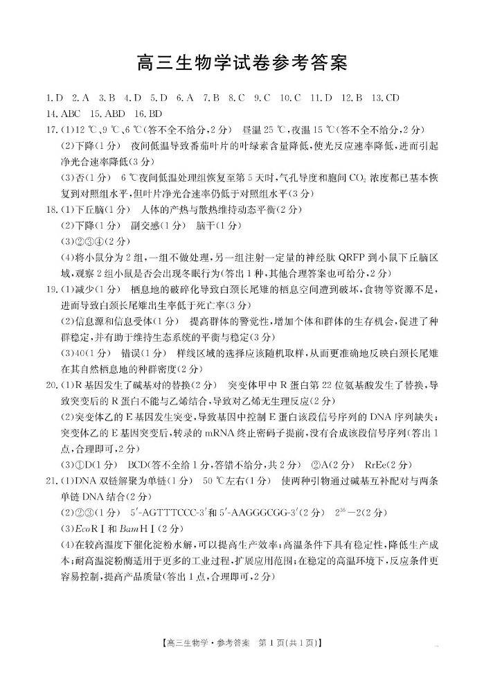 江西省区域高中2024-2025学年下学期2月高三联考生物答案