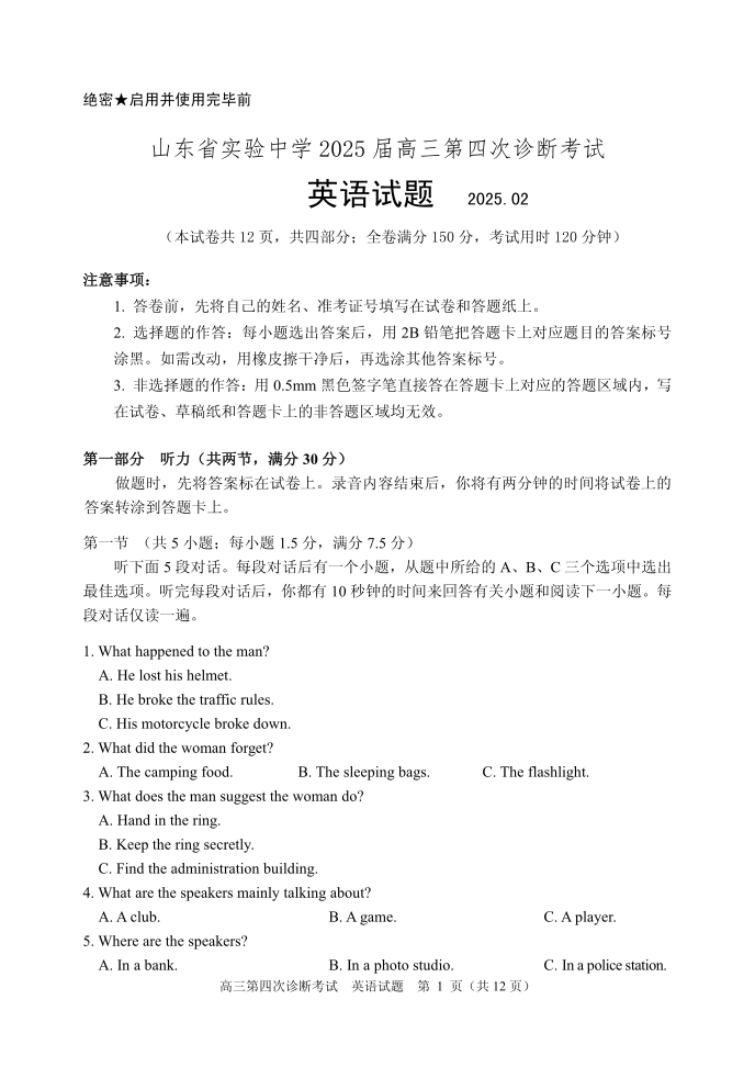 山东省实验中学2024-2025学年下学期2月第四次诊断考试英语