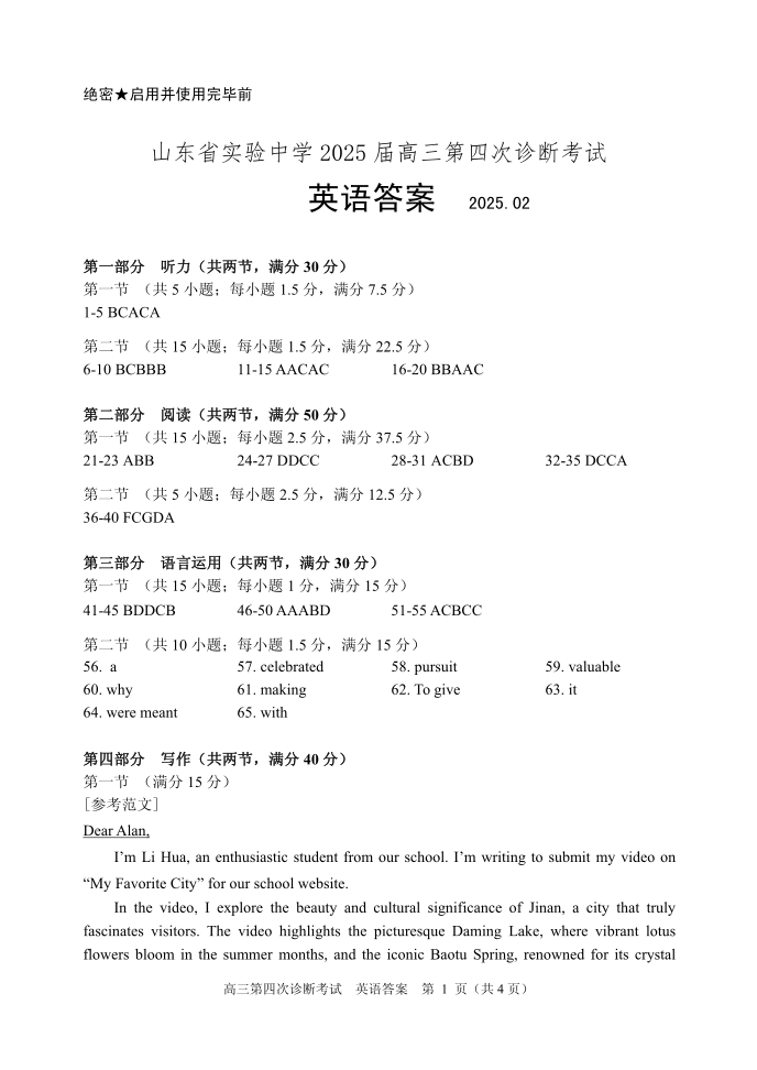 山东省实验中学2024-2025学年下学期2月第四次诊断考试英语答案