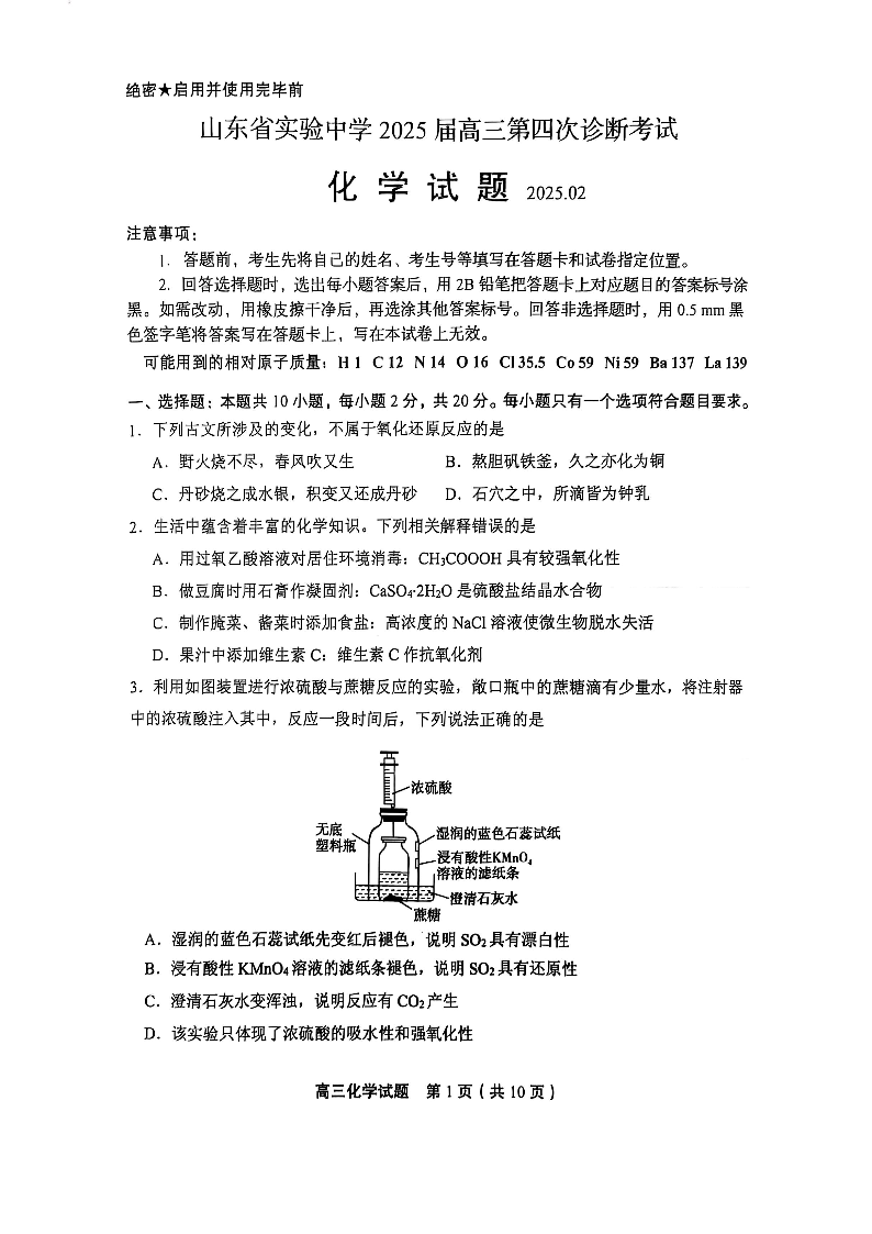 山东省实验中学2024-2025学年下学期2月第四次诊断考试化学