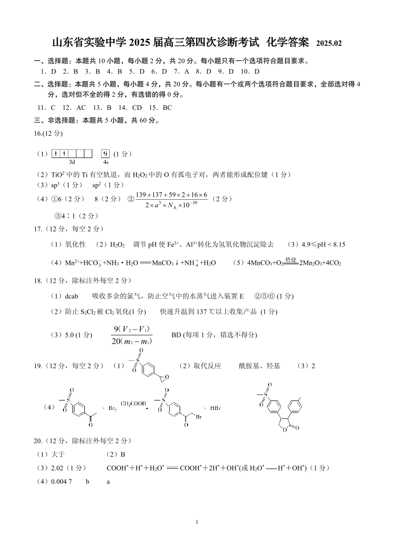 山东省实验中学2024-2025学年下学期2月第四次诊断考试化学答案