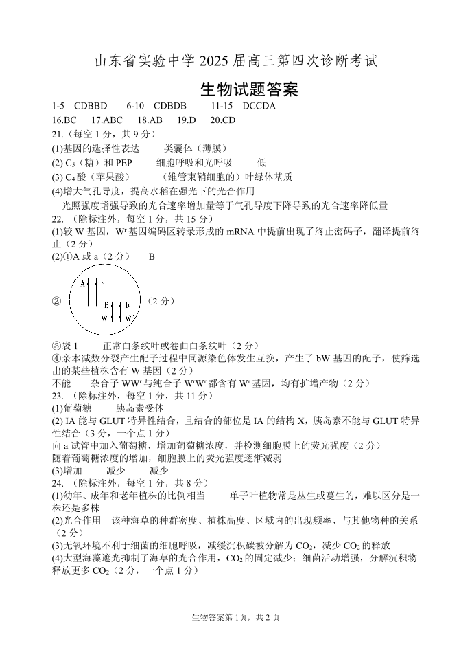 山东省实验中学2024-2025学年下学期2月第四次诊断考试生物学答案