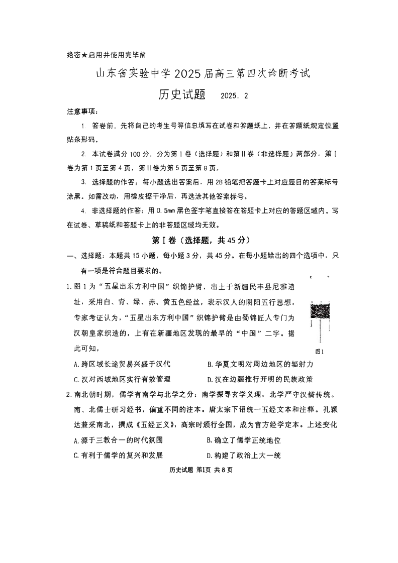 山东省实验中学2024-2025学年下学期2月第四次诊断考试历史+答案