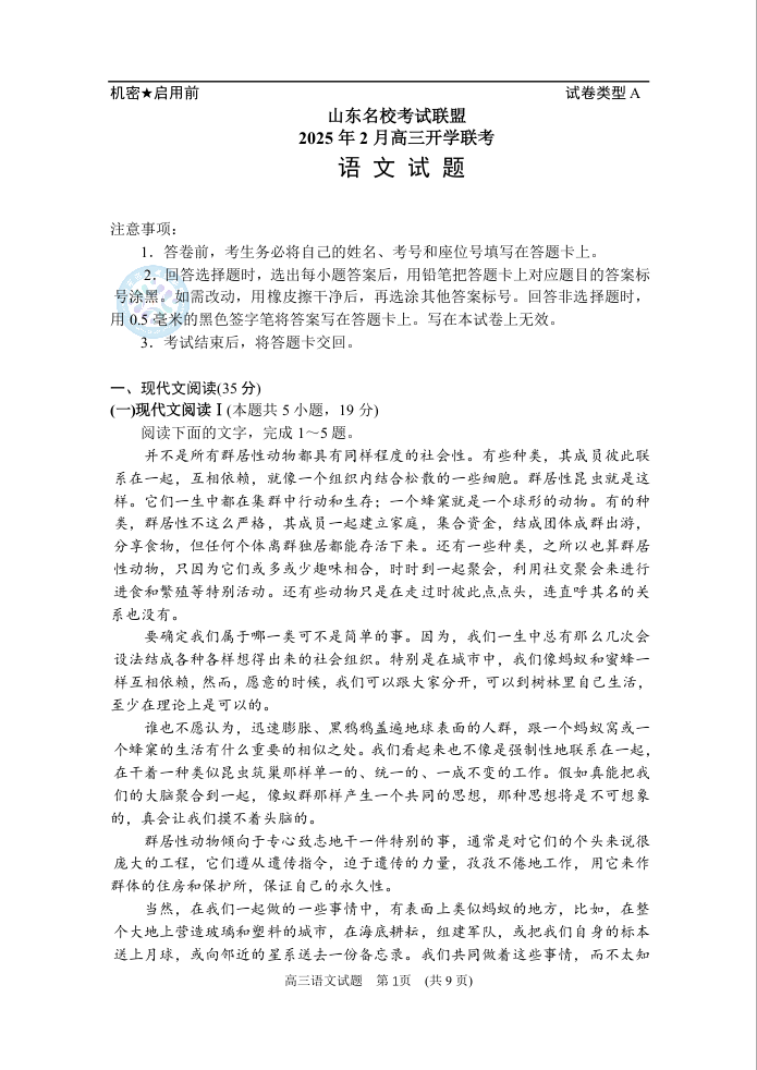山东省济南名校考试联盟2025年2月高三开学联考语文
