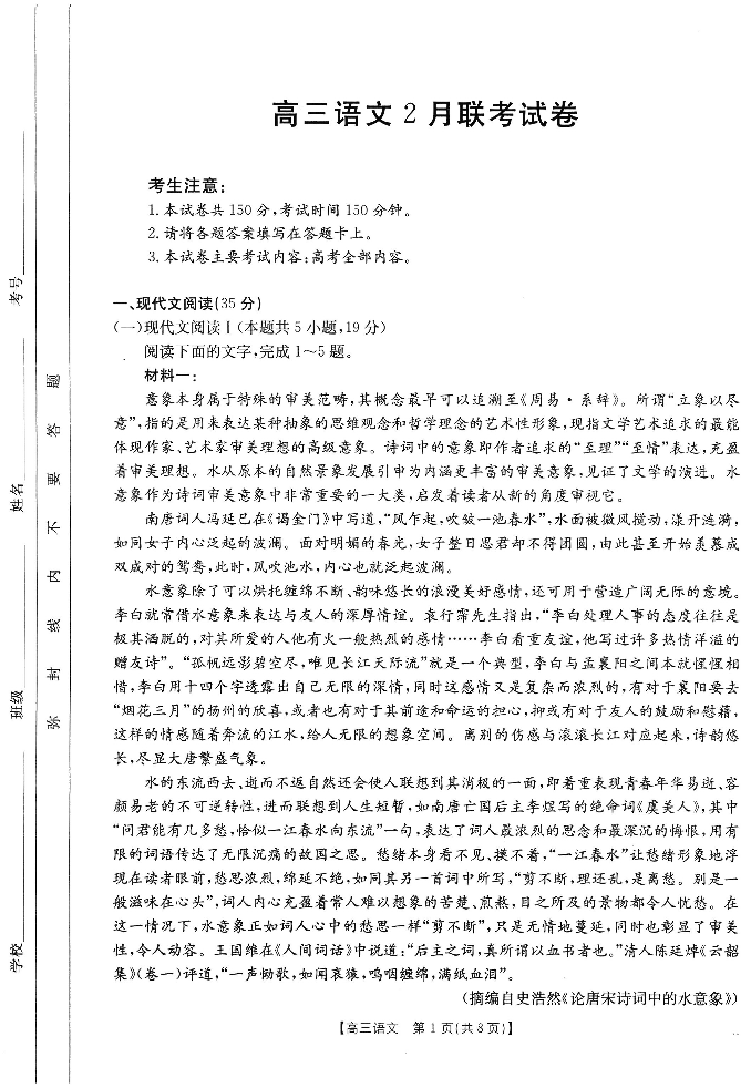 福建省宁德市区域高中2024-2025年下学期2月高三开学考试语文