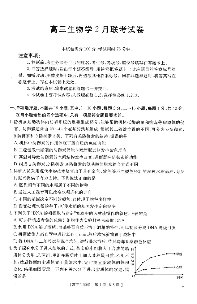 福建省宁德市区域高中2024-2025年下学期2月高三开学考试生物