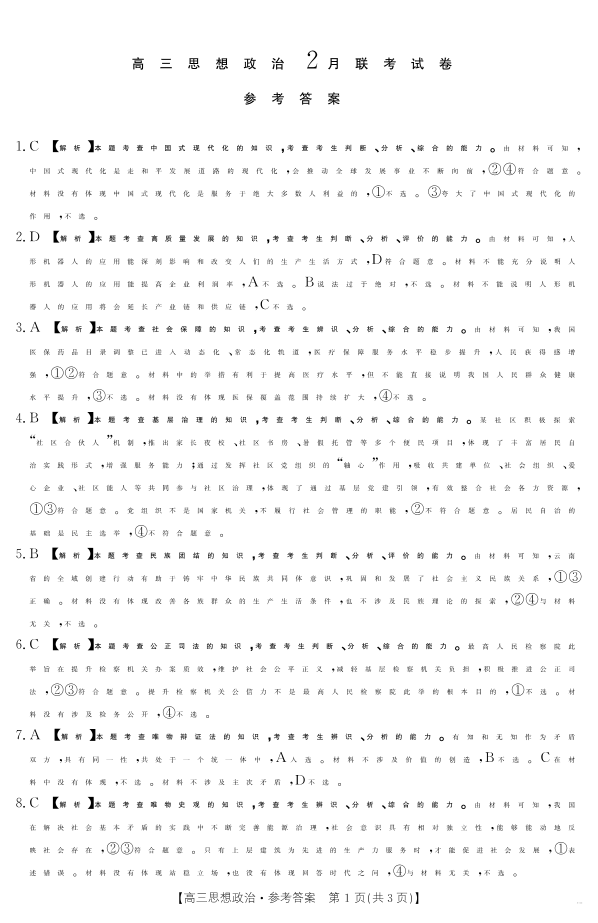 福建省宁德市区域高中2024-2025年下学期2月高三开学考试政治答案