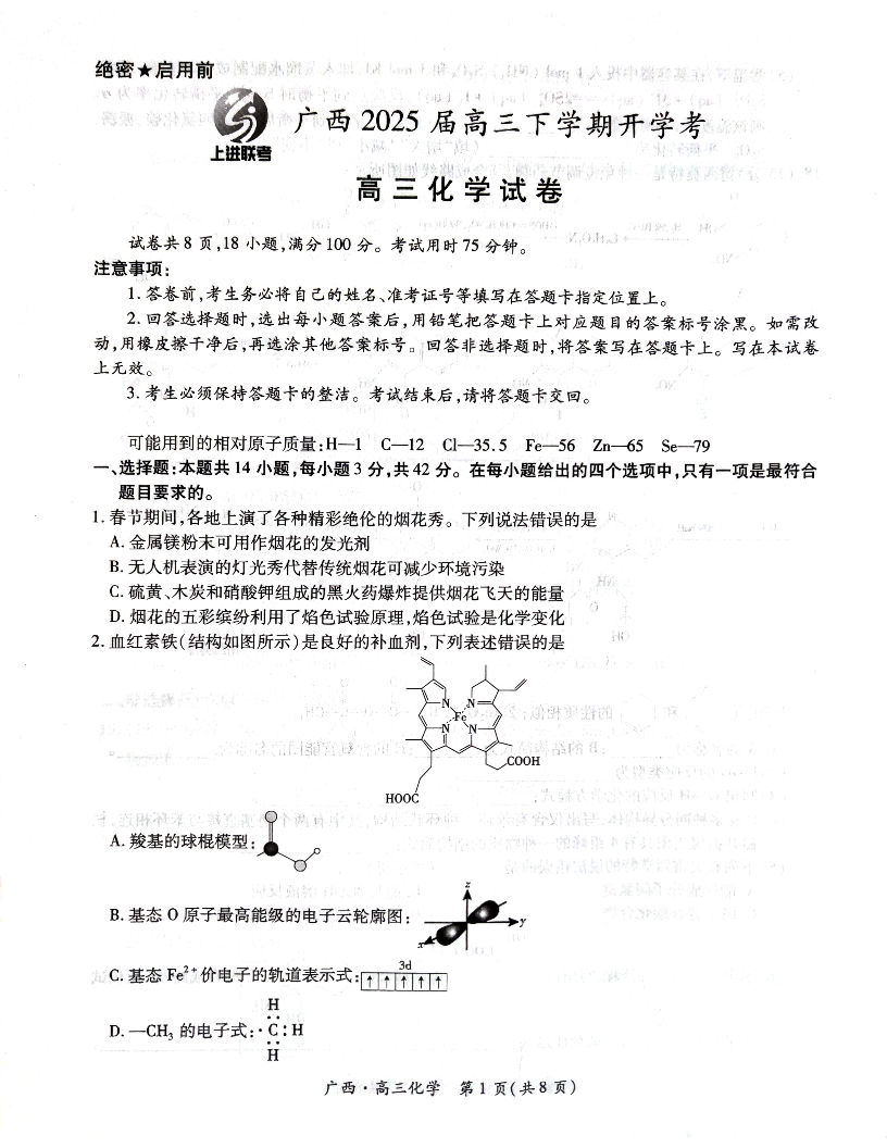 广西省稳派上进联考2024-2025学年下学期2月高三开学考试化学