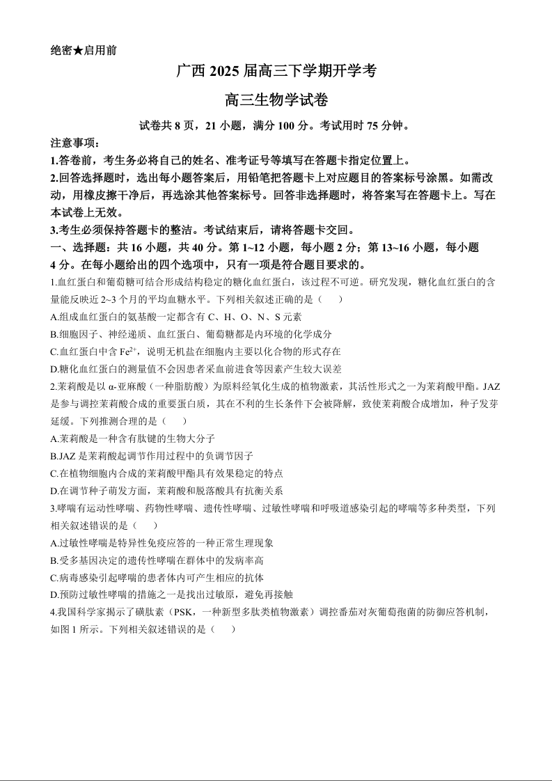 广西省稳派上进联考2024-2025学年下学期2月高三开学考试生物+答案