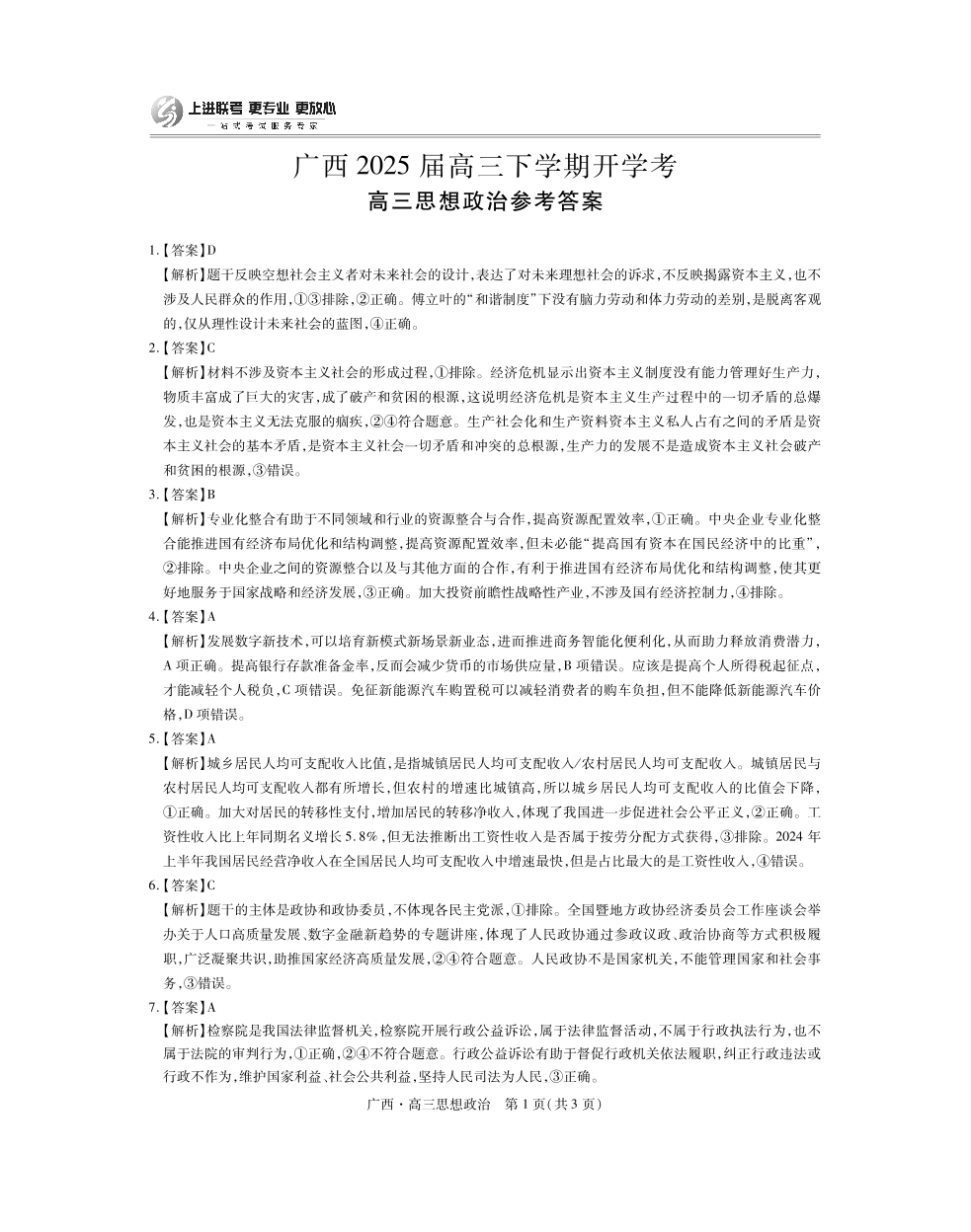 广西省稳派上进联考2024-2025学年下学期2月高三开学考试政治答案