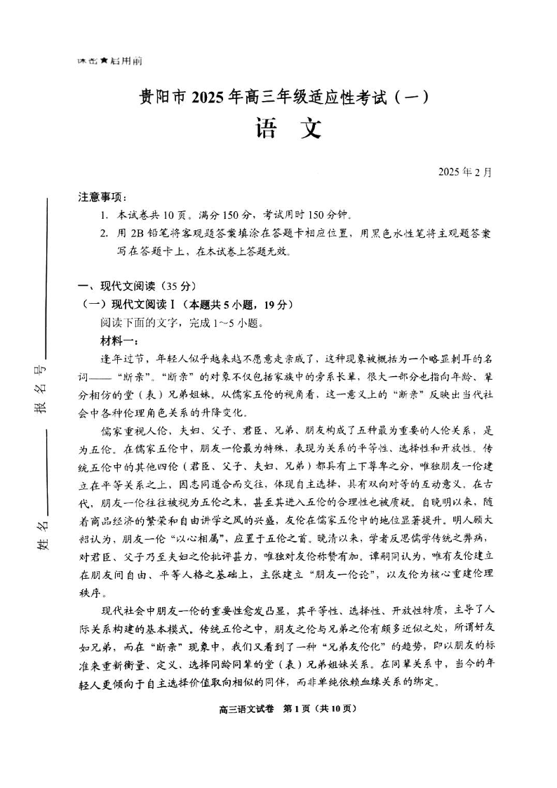贵州省跨区域联考2024-2025学年下学期高三适应性考试(一)语文