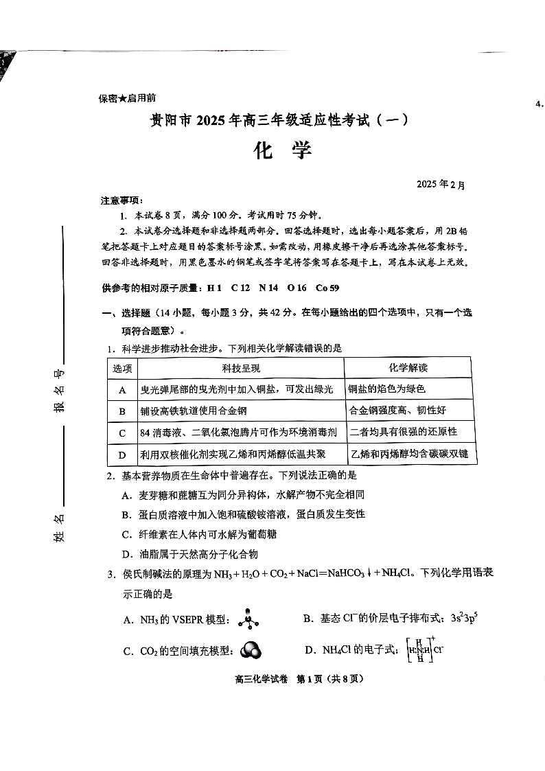 贵州省跨区域联考2024-2025学年下学期高三适应性考试(一)化学