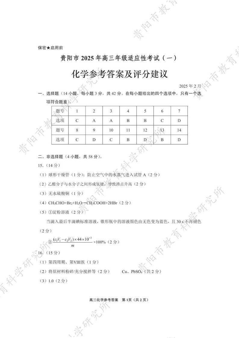 贵州省跨区域联考2024-2025学年下学期高三适应性考试(一)化学答案