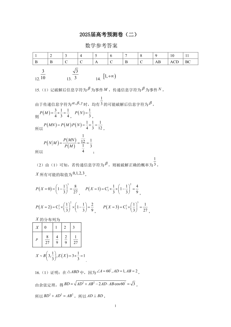 陕西省三重教育2024-2025学年下学期高考预测卷(二)数学答案