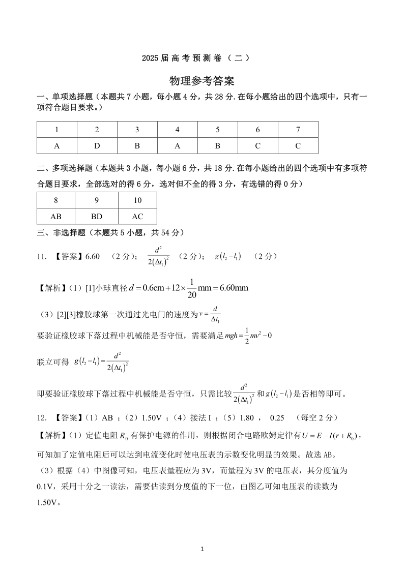 陕西省三重教育2024-2025学年下学期高考预测卷(二)物理答案